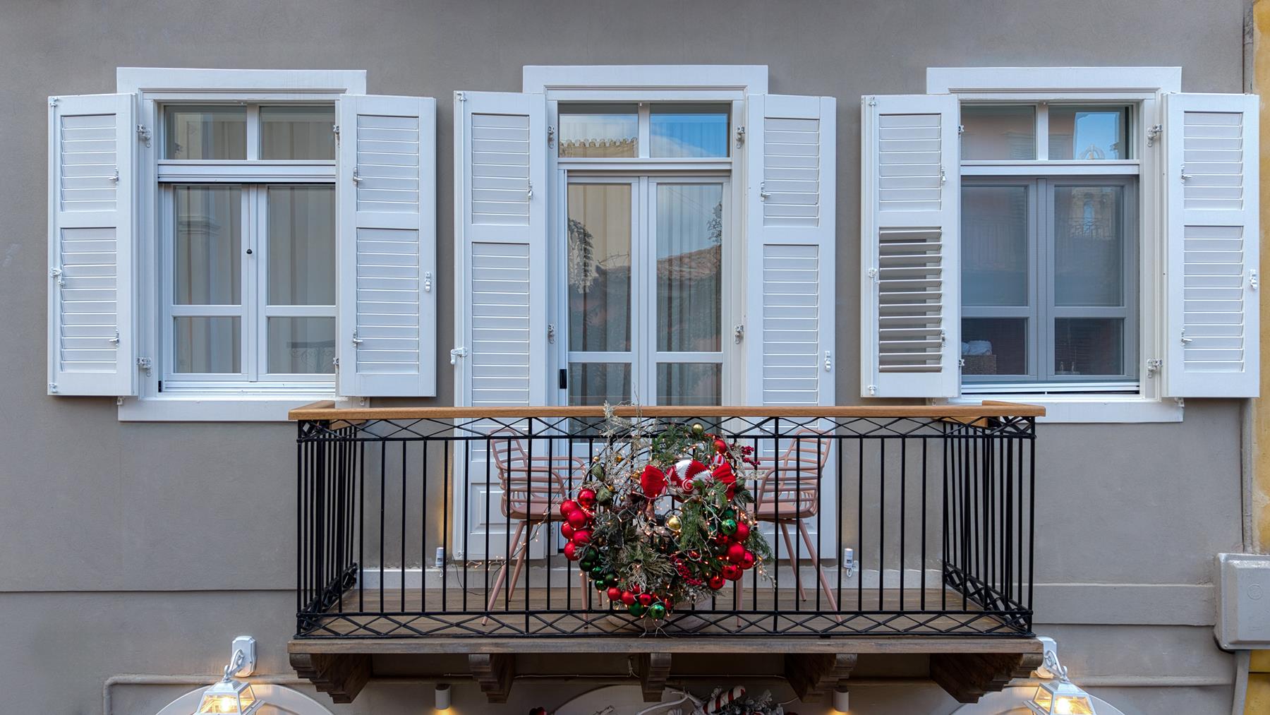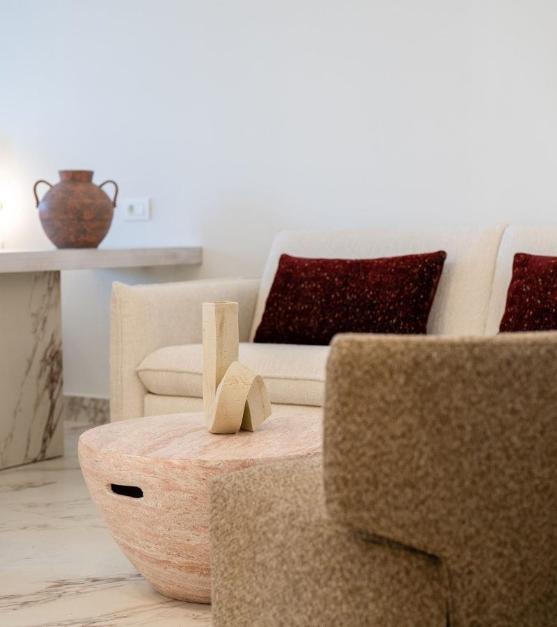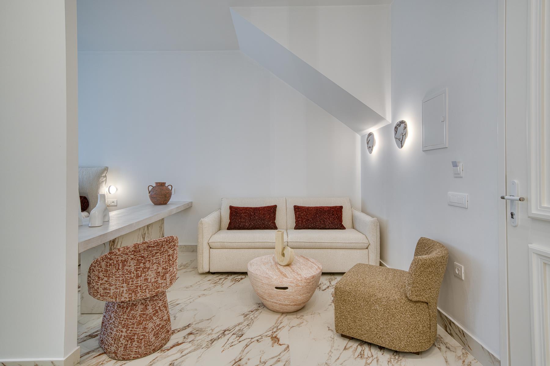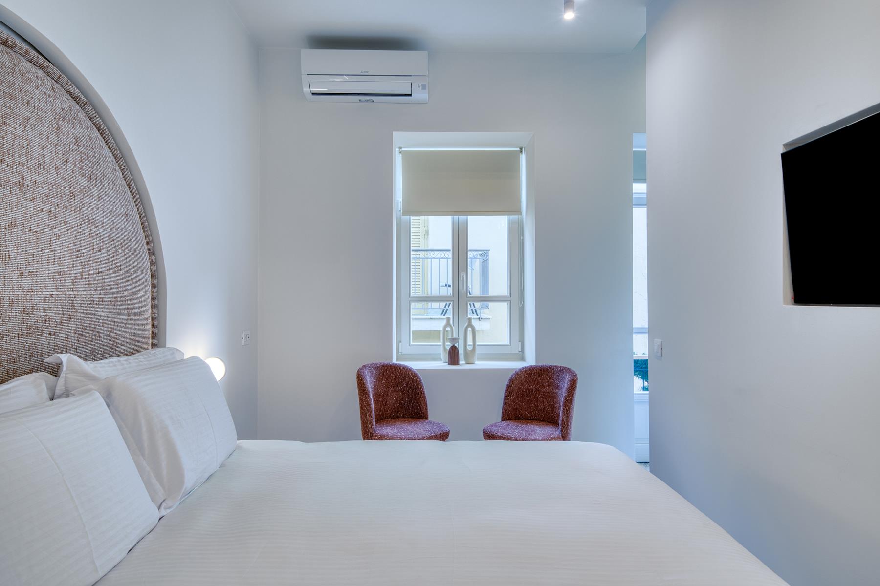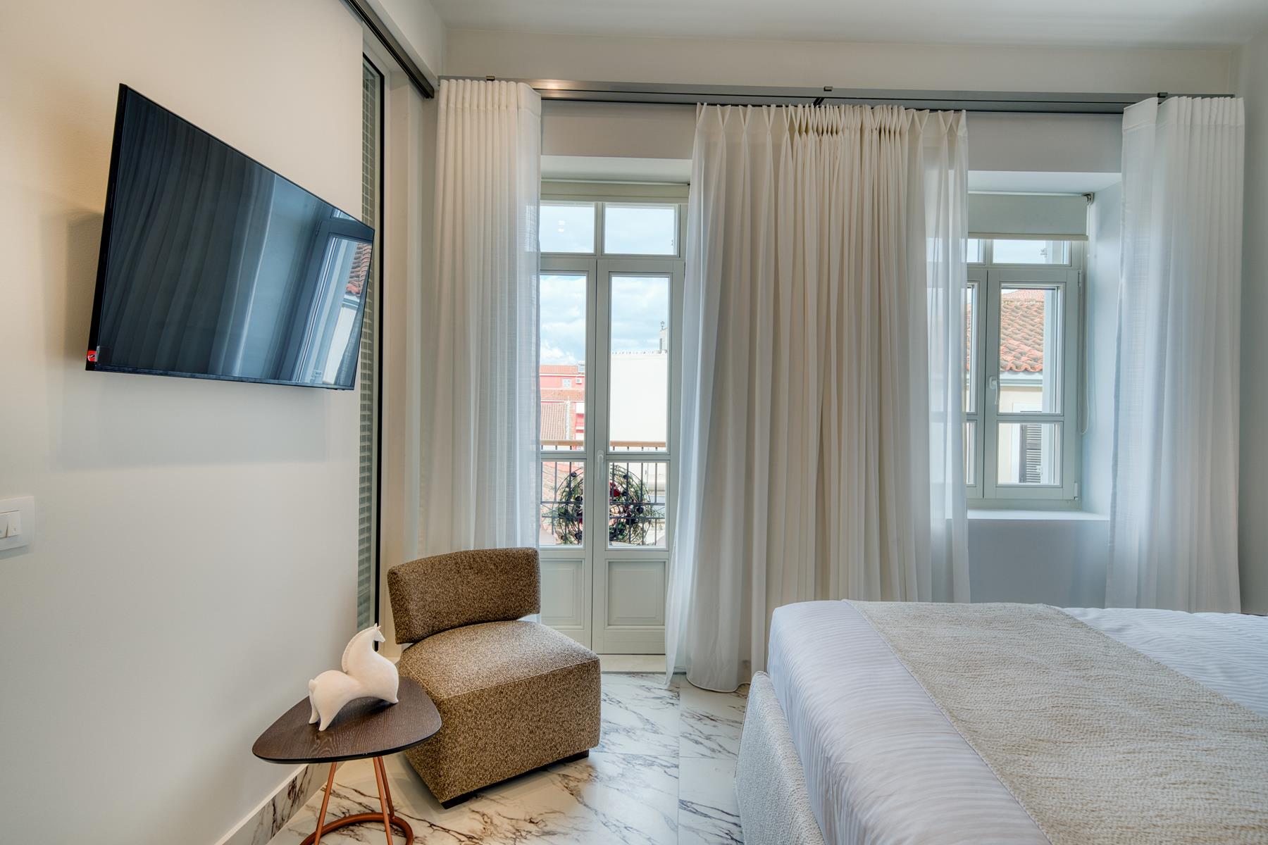 The Suite with King sized bed offering City View (45 sqm) features a king size bed and a sofa that converts into a comfortable double bed and can accommodate a total of 4 people. This Suite features a beautiful balcony and offers a view of a traditional city alley. The brand new construction and its design with a simple color palette of white, soft beige and wood tones with natural stone decoration creates absolute relaxation and a sense of inner peace.