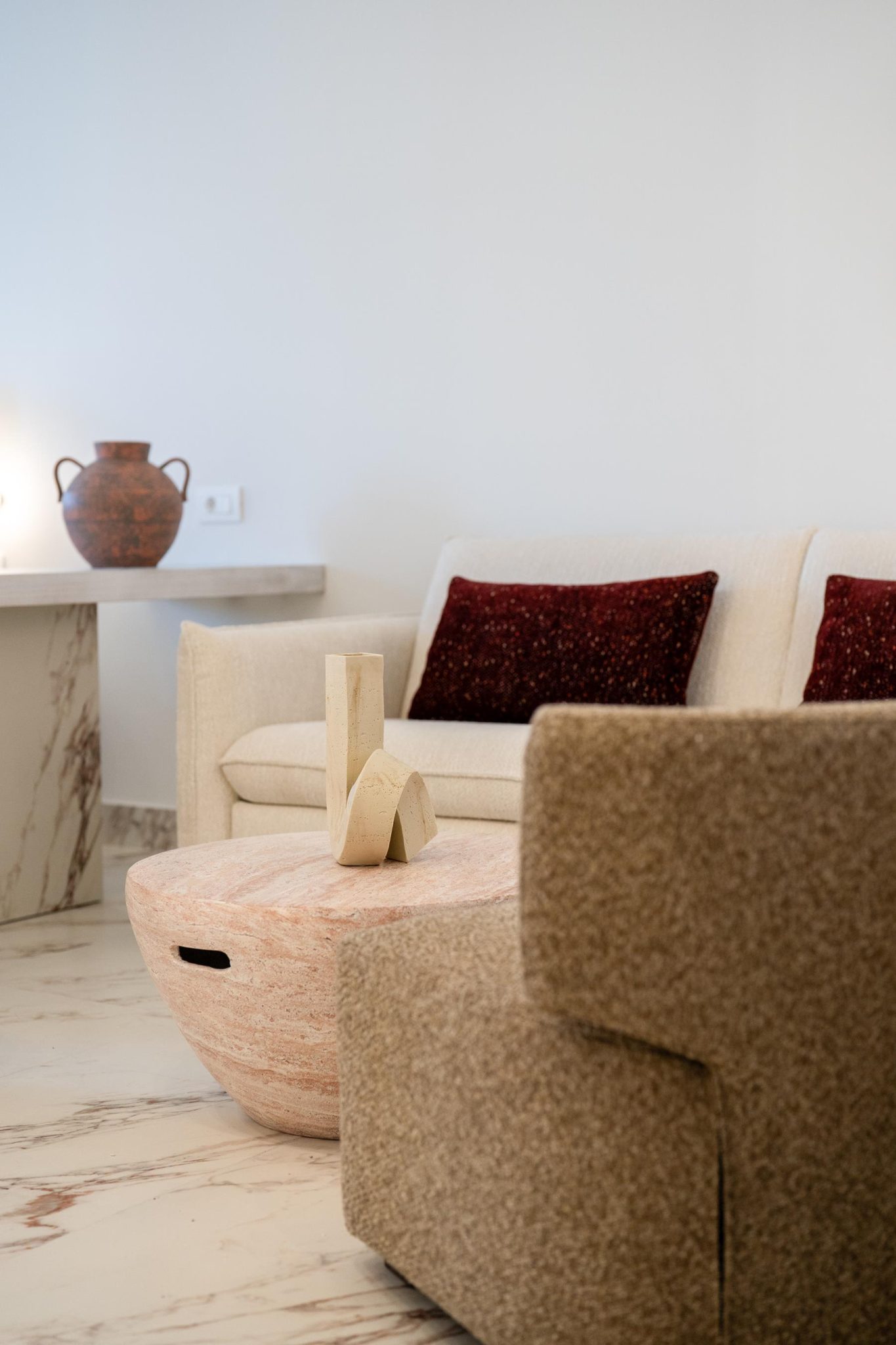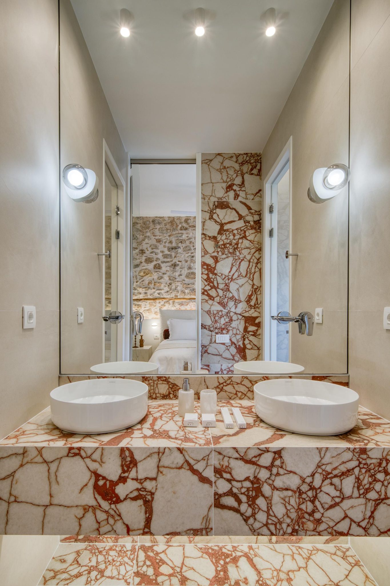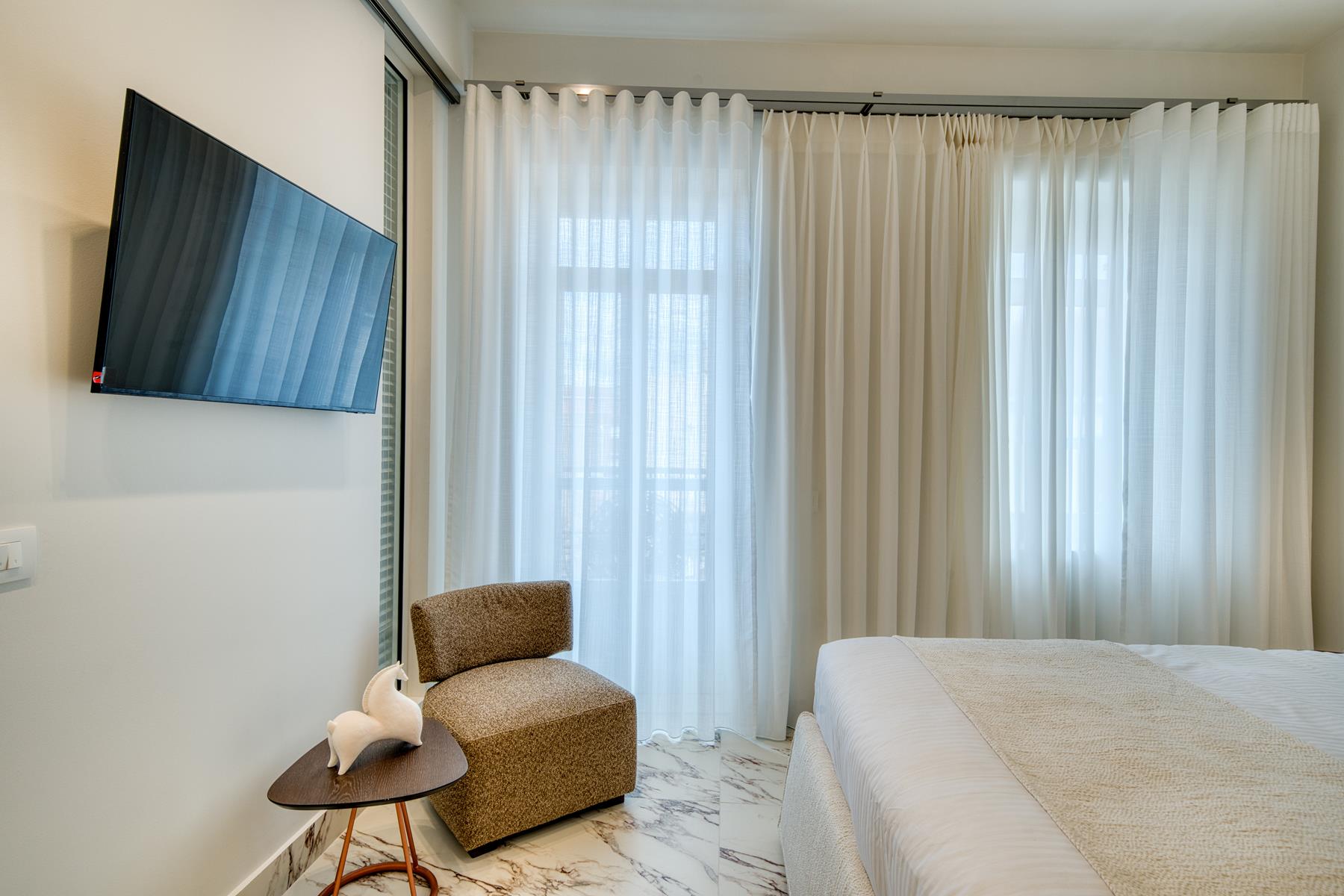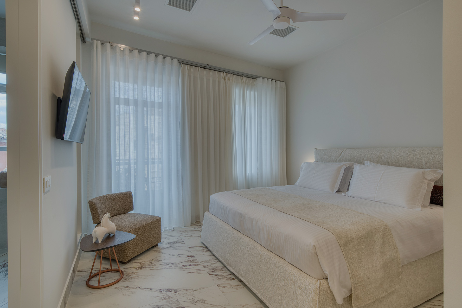 The Suite with King sized bed offering City View (45 sqm) features a king size bed and a sofa that converts into a comfortable double bed and can accommodate a total of 4 people. This Suite features a beautiful balcony and offers a view of a traditional city alley. The brand new construction and its design with a simple color palette of white, soft beige and wood tones with natural stone decoration creates absolute relaxation and a sense of inner peace.